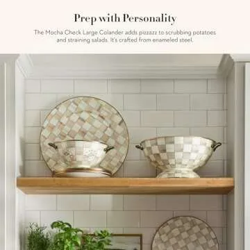 MACKENZIE-CHILDS Enamel Colander, Decorative Kitchen Strainer, Large, Brown-and-White Mocha Check