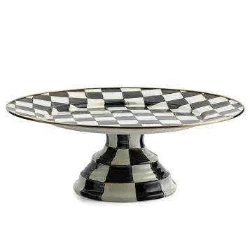 MACKENZIE-CHILDS Enamel Pedestal Platter, Round Cake Stand, Large, Black-and-White Courtly Check