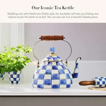 MACKENZIE-CHILDS Enamel Tea Kettle, Stylish Tea Kettle for Stovetop, Blue-and-White Royal Check, 3 Quarts
