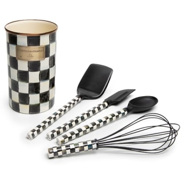 Show moreDiscover the charm of the MACKENZIE-CHILDS Enamel Utensil Set, an essential addition to any cooking space that combines functionality with whimsical design. This beautifully crafted kitchen utensil holder is perfect for those who cherish both aesthetics and gourmet cooking. Each set includes a decorative, extra-tall enamel holder adorned with the signature black-and-white Courtly Check pattern, a turner, a spatula, a spoon, and a large whisk. Designed for entertaining-savvy homes, it makes a delightful gift for newlyweds or anyone settling into a new nest.