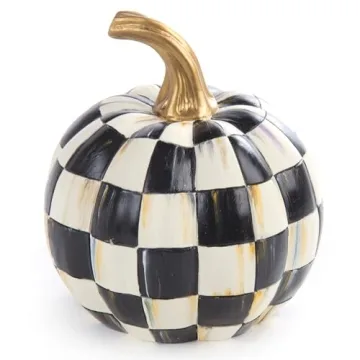 Show moreTransform your home into an autumn wonderland with the exquisite MacKenzie-Childs Mini Decorative Pumpkin. An irresistible masterpiece crafted from high-quality resin, this hand-painted pumpkin features a stunning black-and-white checkered design that perfectly embodies the spirit of the season. Measuring at an ideal size for centerpiece displays or adding flair to your kitchen table, this decorative pumpkin isn't just seasonal decor—it's an elegant addition that transitions effortlessly from Halloween through Thanksgiving, radiating warmth and charm. Topped with a classy gold stem, this captivating piece commands attention, ensuring your festive arrangements are anything but ordinary.