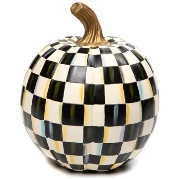 This specific pumpkin features a black-and-white Courtly Check pattern, but MacKenzie-Childs offers various designs in their collection.