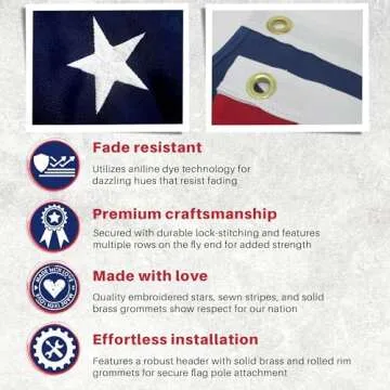 What elevates this flag above the rest is the meticulous craftsmanship that goes into every stitch. With 100% American-made materials, each flag is sewn with dense embroidered stars and fully sewn stripes, ensuring it stands out in any environment. Solid brass grommets provide a secure attachment to any flagpole, allowing this flag to fly high and proud, a beacon of valor even in the strongest winds. Additionally, it features advanced aniline dye technology that promises long-lasting brightness, keeping the flag vibrant even after exposure to the sun and rain.