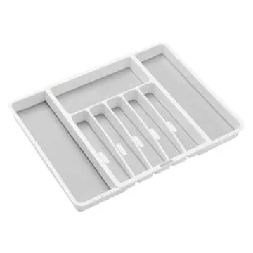 Show more Introducing the madesmart Classic Expandable Silverware Tray, a revolutionary solution for all your kitchen organization needs. This tray transcends the traditional design with its ability to expand from a robust 5-compartment configuration to a spacious 7-compartment layout, allowing you to accommodate more utensils with ease. Crafted from high-quality materials, this tray features a revolutionary soft-grip lining that ensures your silverware stays securely in place, preventing unwanted movement that can lead to chaos in your drawer.