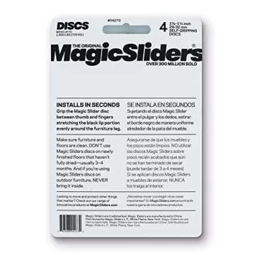 Show moreExperience the ultimate solution to furniture movement with the Magic Sliders L P 4273 round sliders. Designed to seamlessly glide across all surfaces, these durable sliders combine functionality and style, featuring a sleek white and black color scheme that effortlessly fits into any decor. Each pack includes four sliders with a perfect diameter of 1-1/4 inches, making them ideal for various furniture pieces. Whether you're shifting around a couch, chair, or any other heavy object, these lightweight sliders (just 0.06 lb each) make it a breeze to rearrange your space without scratching your floors or straining your back.