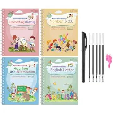 Show more Introducing the innovative Magic Ink Copybook Set, a delightful teaching aid designed specifically for young learners eager to enhance their writing, drawing, and mathematical skills. This 4 in 1 copybook set features engaging activities like English letters, addition and subtraction exercises, and fun drawing tasks, all encompassed within a durable set of spiral-bound books. With its unique magic ink feature, children can practice endlessly, as the ink automatically fades away in just 30 minutes after use, allowing for repeated practice without waste.