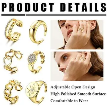 Show more Introducing the Magitaco 6Pcs Gold Chunky Rings Set, your perfect accessory for embracing the latest trends in jewelry fashion! This exquisite collection features six stunning rings, including dome, braided, twisted, and signet styles, all designed to add a playful edge to your everyday outfits. The gold finish of these rings is crafted with precision and care, ensuring that they not only look fabulous but also resist fading even after repeated wear. With varying styles at your fingertips, you can easily mix and match these rings to create an ensemble that showcases your unique personality.