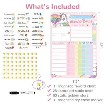 Show moreWelcome to a world of motivation and fun! Meet our Magnetic Chore Chart for Kids, a beautifully illustrated unicorn-themed reward chart designed specifically to make daily chores exciting for children. Measuring 8.5” x 12”, this chore chart is perfect for toddlers, kids, and teens who need a little encouragement on their journey to learn responsibility. Comes complete with 26 static tasks and 63 golden stars that your little ones will love to earn. The addition of a magnetic dry erase marker empowers kids to customize their tasks and rewards as they see fit, ensuring a unique and personal experience for every user. It's not just a chore chart; it's a wonderful way to foster responsibility in a fun and engaging way!