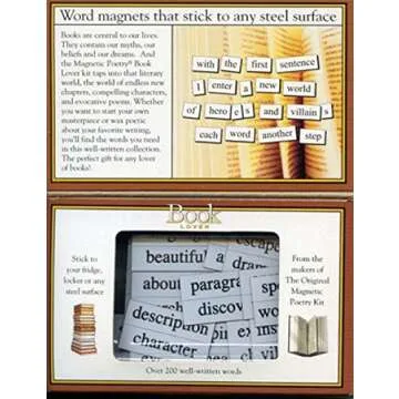 Show moreUnleash the inner poet in you or your loved ones with the Magnetic Poetry Kit: Book Lover. This delightful set, designed for literary enthusiasts, provides a creative outlet that allows users to express their thoughts, emotions, and stories using over 200 themed magnetic word tiles. Housed in a beautifully designed 4.75 x 3 inch gift box, it's the perfect present for anyone who enjoys the magic of words. Each tile boasts enchanting themes such as character, desire, and mystery, inviting users to craft everything from profound poetry to playful messages on home appliances!