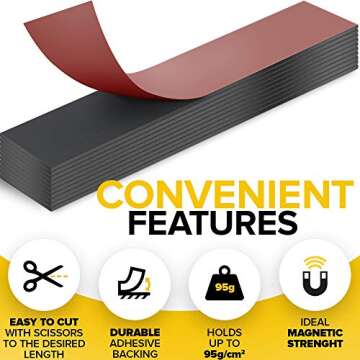 Show moreTransform your workspace with the X-bet MAGNET Flat Thin Magnetic Tape that stands at the forefront of the crafting world. Renowned for its exceptional quality and strength, this magnetic tape has been meticulously designed to cater to the needs of DIY enthusiasts and professionals alike. Measuring 6 inches by 1 inch and only 0.08 inches thick, it seamlessly blends into any environment while providing robust support for your tools and crafts. Crafted from premium materials, including a high-performance 3M anisotropic magnet, this adhesive-backed strip guarantees a holding power of 675 Gauss, making it one of the strongest options available. Each package comes with 11 versatile pieces, ensuring you have more than enough material to organize your space effectively.