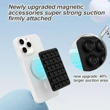 Show moreIntroducing the Magnetic Suction Phone Mount for MagSafe Case, a revolutionary accessory designed to elevate your smartphone experience. Perfectly compatible with the iPhone 16/15/14/13/12 series and other MagSafe phones, this innovative mount also caters to non-MagSafe devices with a cleverly included plastic magnetic ring. With a sleek black finish, this mount doesn’t just add functionality but enhances aesthetic appeal, making it a stylish addition to your daily tech essentials. Designed with 24 robust suction cups, each boasting a 12mm diameter, you can expect exceptional performance with a grip that is 40% stronger than typical silicone mounts. The hard PC board base guarantees a secure attachment to various smooth surfaces without compromising your device's integrity. Whether you are streaming your favorite series, capturing perfect selfies, or engaging in video calls, this mount is your reliable companion, ensuring you enjoy hands-free convenience wherever you go.