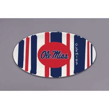 Show more Introducing the Magnolia Lane University of Mississippi Ole Miss Football Oval Striped Platter, a stunning addition to any dining experience! Crafted from high-quality melamine, this platter impressively mimics ceramic aesthetics while ensuring practicality and durability. Measuring 6.75” x 12.25”, it strikes the perfect balance between style and functionality, making it an ideal choice whether you're hosting a game day gathering or enjoying a family meal. Its vibrant colors and trendy striped design are sure to bring your table to life.