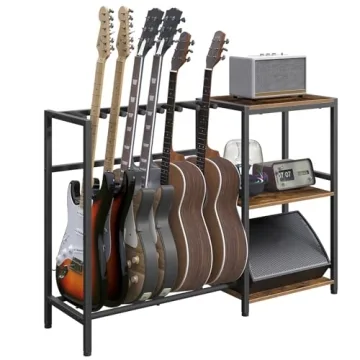 Show more If you’re looking for a way to display your string instruments while keeping your space organized, look no further than this innovative guitar display rack. Crafted from high-quality particleboard and a sturdy metal frame, it promises durability and reliability for all your musical needs. With an ample storage capacity of holding 5-7 different types of string instruments including acoustic, electric guitars, bass, and banjos, it serves as the perfect solution for musicians seeking a stylish way to showcase their gear.