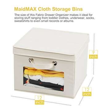 Show moreIntroducing the MaidMAX Closet Storage Cube Set – the ultimate solution for keeping your spaces organized and clutter-free! Measuring at a compact 12 x 12 x 9 inches, these stylish beige storage bins are perfect for fitting snugly into closets, under beds, or on shelves. Each cube is equipped with a clear window that provides easy visibility, allowing you to quickly identify contents without rummaging through. The combination of durable polyester, nonwoven fabric, and sturdy cardboards ensures longevity, making these boxes perfect for both home and office use.