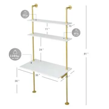 Show more Welcome to a world of style and utility with the MAIKAILUN White and Gold Desk. This elegant 36" Ladder Wall Desk is perfectly designed to fit into tight spaces without sacrificing functionality or aesthetics. Measuring L: 36 x W: 20 x H: 81 inches, it is the quintessential addition to small rooms, dormitories, or cozy apartments. The stunning silky gold-tone finish brings a touch of luxury, while the sturdy metal pipe frame ensures durability and can handle a remarkable load capacity of up to 110 LB for your writing needs and 22 LB per shelf. Abuse it all you want - it's built to last and elevate your workspace.
