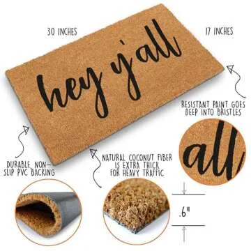 Show moreIntroducing the MAINEVENT Hey Y'all Welcome Mat—the ideal mat that masterfully combines functionality with a delightful charm that embodies southern hospitality. At a generous size of 30x17 inches, this doormat is crafted from high-quality coir fibers, making it a durable and stylish choice for year-round usage. Its subtle yet inviting phrase, "Hey Y'all," coupled with the natural fibers, resonates beautifully with both the aesthetics of fall and the warm vibes of southern living. Not only does it serve as a functional entryway accessory, but it also transforms your doorstep into a welcoming haven for guests.