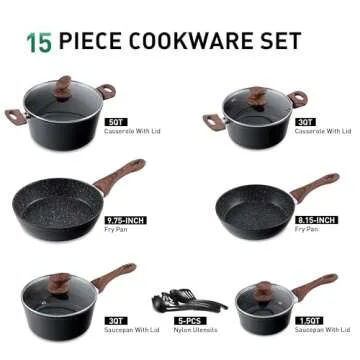 MAISON ARTS 15-Piece Non Stick Cookware Set with Black Granite Finish