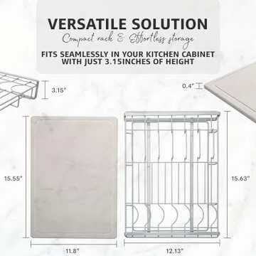 Show more Transform your kitchen space with the MAISON DIATOMEE Stone Drying Mat Bundle, an innovative solution that merges style and functionality. Crafted from high-quality diatomaceous earth, our mat features a sleek, white stainless steel rack that not only enhances the visual appeal of your kitchen but also maximizes efficiency. With dimensions of 15.5" x 11.8" for the mat and 15.63" x 12.13" for the rack, it fits perfectly alongside your sink, ensuring that you can dry your dishes efficiently without mess.
