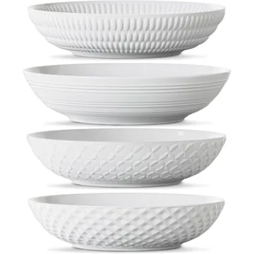 Show moreElevate your dining experience with the stunning Maison Neuve Set of 4 White 34oz Porcelain Dinner Bowls. These exquisite bowls are crafted from authentic porcelain, expertly designed not only to be visually appealing but also durable enough for everyday life. The refined textures and sophisticated designs—ranging from diamonds to stripes—ensures that each bowl contributes a unique touch to your table setting. With a generous capacity of 34 ounces, these bowls are perfectly sized for everything from hearty pasta servings to fresh salads, making every meal a cherished affair.