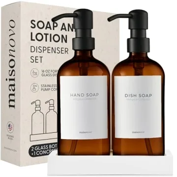 Introducing the stunning MaisoNovo Glass Soap Dispenser Set, a perfect blend of elegance and practicality for your bathroom or kitchen countertop. This exquisite pack consists of two premium amber glass dispensers, each with a generous capacity of 16.9 fl oz (500ml), equipped with sleek black stainless steel pumps that ensure durability and style. Accompanied by a robust concrete tray and waterproof labels for hand soap, body wash, dish soap, lotion, shampoo, and conditioner, this set guarantees...