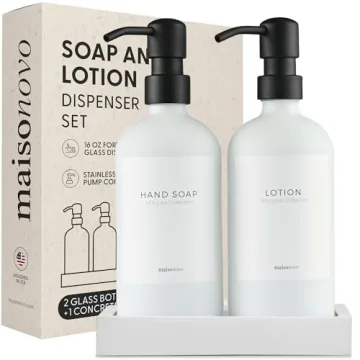 Show moreTransform your bathroom experience with the exquisite MaisoNovo Glass Soap Dispenser Set. This elegant set features two captivating white glass soap dispensers, expertly crafted to bring both style and functionality to your home. Each dispenser boasts a generous capacity of 16.9 fl oz (500 ml) and comes equipped with a chic black stainless steel pump that ensures easy dispensing of your favorite soaps and lotions.
