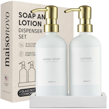 Show moreTransform your kitchen and bathroom experience with the **MaisoNovo Soap Dispenser 3-Piece Set**. This elegant collection includes two stunning white glass soap dispensers, each boasting a generous capacity of **16.9 fl oz/500 ml** and topped with stylish **gold stainless steel pumps**. Designed to offer both functionality and aesthetic appeal, the dispensers are accompanied by a robust concrete tray that not only elevates the look of your decor but also organizes your sink area with finesse. This set is not just about beauty; it is about practicality, featuring durable waterproof labels for hand soap, sanitizer, dish soap, and lotion, ensuring you have a sophisticated and functional setup on your countertop.