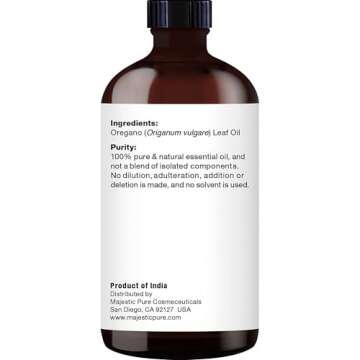 Show moreIntroducing the **Majestic Pure Oregano Essential Oil**, an exceptionally potent and versatile oil recognized for its myriad of benefits. This 100% pure and natural oregano oil stands as a testament to the purity and quality that Majestic Pure delivers. Extracted from the finest oregano sourced globally, this oil remains undiluted, with no fillers or additives, ensuring you receive only the best. Each bottle undergoes rigorous independent lab testing, providing assurance of its efficacy and safety, further solidifying its status as a premium-grade essential oil. Perfect for various applications, including hair care, skin care, aromatherapy, and massage therapies, this oil is a valuable addition to your wellness regimen.