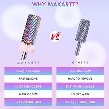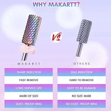 When comparing the Makartt Nail Drill Bits set with other brands, our set stands out for its superior material quality and range of bit types. Many competitors offer limited options with less durable materials. In contrast, our tungsten carbide bits minimize dust and heat for a safer user experience. While some competitors focus solely on cutting bits, we provide a comprehensive collection that caters to a full spectrum of nail care needs, ensuring optimal efficiency and results.