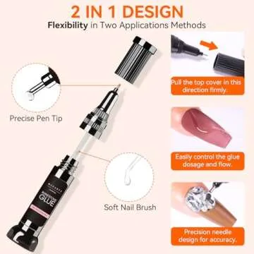 Show more Introducing the ultimate solution for nail art enthusiasts: the Makartt Nail Rhinestone Glue. This innovative nail glue gel is engineered with a Dual Head Design for Easy Application, making it perfect for both beginners and seasoned nail artists. The unique brush and pen tip applicators allow for precise application, ensuring you'll never have to worry about messy applications again. The brush tip is designed for covering larger areas while the pen tip is perfect for those intricate details and individual rhinestones that add that special touch to your nail creations.
