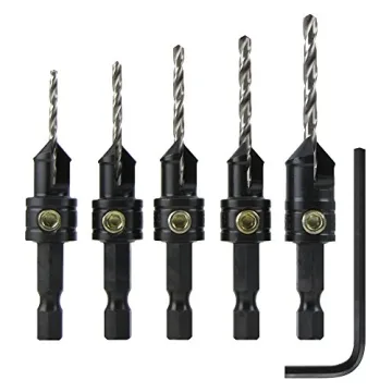 The set includes five countersink drill bits, specifically designed for screws ranging from #4 to #12.