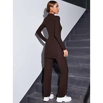 MakeMeChic Women's 2 Piece Outfits Long Sleeve Ribbed Knit Top and Pants Set Brown S