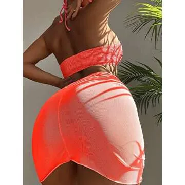 MakeMeChic Women's 3 Piece Bathing Suits Halter Ring Bikini Set with Cover Up Skirt Coral Orange S
