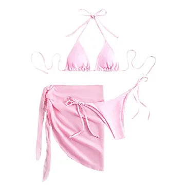 Show moreIntroducing the enchanting MakeMeChic Women's 3-pack Triangle Bikini Swimsuit & Beach Skirt in Pink, a stunning addition to your summer wardrobe. This exquisite bikini set is the ultimate blend of comfort, style, and playful elegance, perfect for beach lovers and sunbathers alike. Crafted from a premium mix of 82% Polyester and 18% Spandex, this set boasts exceptional stretchability and a snug fit that perfectly accommodates your body's curves. Each set is thoughtfully designed with a stylish halter top, chic tie-side thong bottoms, and a gorgeous wrap skirt that adds a touch of sophistication to your beach attire. Whether you're lounging at the pool, hitting the beach, or even attending an upscale pool party, this bikini set is crafted to enhance your summer experience.