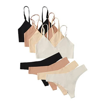 MakeMeChic Women's 4 Pack Seamless No Show Bra and Panty Set is your go-to solution for stylish comfort! This beautifully curated set includes four solid v-neck bralettes and matching low-rise thongs, perfect for any occasion—be it lounging at home, sleeping, or layering under your favorite outfits. Crafted from stretchy and ultra-soft materials, these pieces redefine comfort, allowing you to feel relaxed while looking effortlessly chic. Made with precision, each item hugs your curves while...