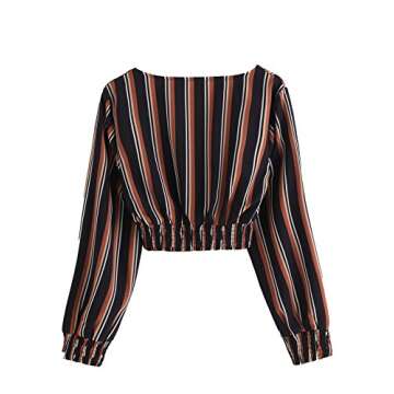 MakeMeChic Women's Casual Long Sleeve V Neck Striped Crop Blouse Top Multi S