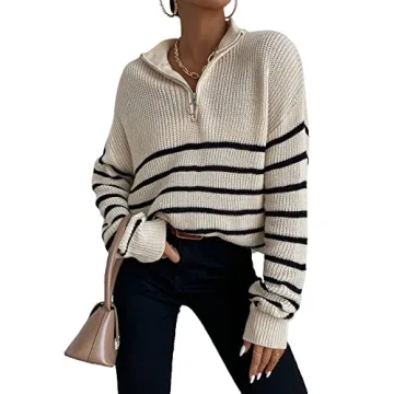 Feature: long sleeve, zip front, half placket, striped pattern, loose fit, pullover sweaters for women
