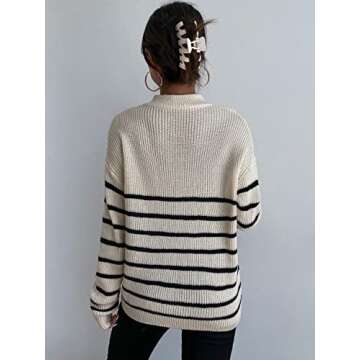 Show moreIntroducing the MakeMeChic Women's Casual Striped Half Zip Up Drop Shoulder Long Sleeve Sweater Pullover Top in Apricot – a perfect fusion of style, comfort, and versatility designed for today's modern woman. This exceptional sweater features a chic striped pattern that brings a fun twist to your everyday look, while the gentle fabric stretch ensures a soft and comfortable fit that feels great against the skin. The long sleeves and half placket zip front add a touch of sophistication, making it an ideal piece for layering during the colder months. Whether you're out for coffee or heading to the office, this pullover is a fashionable addition to any wardrobe.