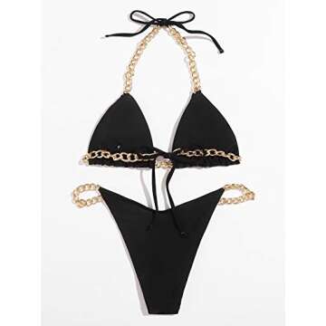 MakeMeChic Women's Chain Linked Triangle Bikini Swimsuit High Cut Bathing Suit Black L