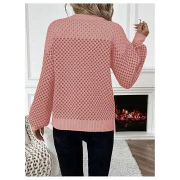 MakeMeChic Women's Color Block Houndstooth Oversized Sweater Long Sleeve Crew Neck Knit Pullover Top Pink Small