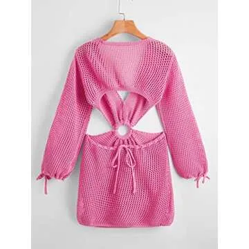 MakeMeChic Women's Crochet Cover Up Long Sleeve Knitted Swim Beach Cover Up Dress Swimwear Hot Pink M