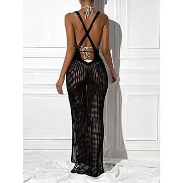 Show moreStep into the summer sun with confidence in the MakeMeChic Women's Crochet Cover Up Sleeveless Cross Back Split Maxi Beach Dress. This stunning beach cover-up is designed to elevate your beachwear, showcasing your swimsuit with its exquisite crochet patterns and sexy silhouettes. Made from high-stretch fabric, it ensures a comfortable fit while allowing for freedom of movement. The sophisticated V neckline and hollow-out design create an alluring appeal, perfect for lounging by the pool or strolling along the shoreline. Whether you are soaking up the sun or enjoying a beachside cocktail with friends, this cover-up is a must-have addition to your summer wardrobe.