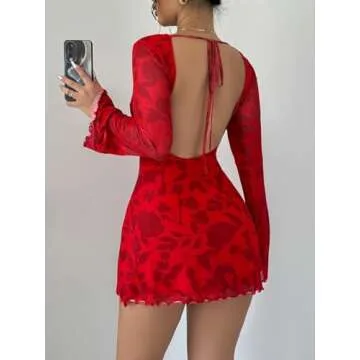 MakeMeChic Women's Floral Print Long Sleeve Mini Dress Mesh Backless Y2k Going Out Dresses Red Small