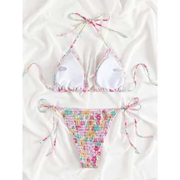 Show more Introducing the MakeMeChic Women's Halter Tie Side Triangle Bikini Set, a stunning high-cut 2-piece swimsuit designed to make you look and feel your best during the summer! Featuring an attractive multi-floral print, this bikini is perfect for flaunting your style by the pool or at the beach. Crafted with stretchable fabric, it hugs your body's curves beautifully, providing both comfort and support for all-day wear.
