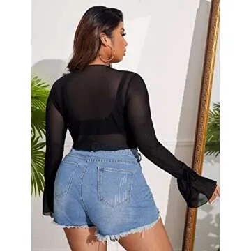 Show moreIntroducing the MakeMeChic Women’s Plus Size Tie Front Long Bell Sleeve Deep V Neck Lettuce Trim Sheer Mesh Crop Blouses Tee Tops in striking black, designed for the modern woman who appreciates style, comfort, and versatility. This stunning crop top features long flounce sleeves that flutter elegantly with movement, and a deep V-neck that beautifully frames the neckline. Crafted from soft, slightly stretchy fabric, it ensures a comfortable fit that hugs your curves in just the right places, making it perfect for various occasions. The sheer mesh fabric adds a hint of allure while the lettuce trim provides a trendy finishing touch, setting you apart wherever you go.