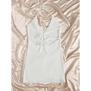 MakeMeChic Women's Sleeveless Halter Tie Back Knitted Swim Beach Cover Up Dress White S