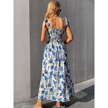 MakeMeChic Women's Summer Boho Dress Casual Floral Print Spaghetti Strap Square Neck Long Maxi Dress Beach Sun Dress A Blue and White S
