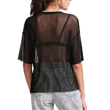 Show moreUnleash your summer style with the MakeMeChic Women's Summer Short Sleeve Tops, an exquisite blend of comfort and chic elegance. This sheer mesh blouse is crafted from luxuriously soft and stretchy fabric that gently caresses your skin, ensuring you feel as good as you look. With its trendy short sleeves and round neck, this blouse presents a sophisticated yet sexy silhouette, perfect for pairing with your favorite black bra for a bold, captivating look. Ideal for warm weather, this versatile piece can be dressed up or down, making it a must-have addition to your summer wardrobe.
