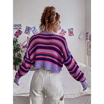 Show moreIntroducing the MakeMeChic Women's Y2K Striped Cropped Sweater, a stylish and versatile addition to your wardrobe. This eye-catching sweater combines the best of retro-inspired fashion with a modern twist. Crafted from a high-quality fabric that has a slight stretch, it provides both comfort and a flattering fit. The long sleeves and round neck design are perfect for transitioning between seasons, while the cropped length adds a trendy vibe that pairs well with high-waisted jeans or skirts. Available in a vibrant purple stripe, this knitted crochet pullover is ideal for making a statement whether you're headed out on the town or enjoying a cozy day indoors.