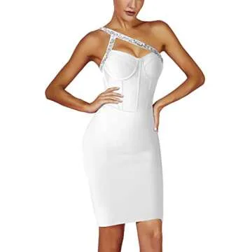 Maketina Women's Rhinestone One Shoulder Bandage Dress Midi Bodycon Dress Cocktail Party White M