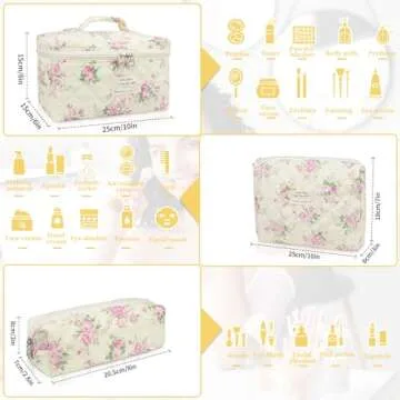 Makeup Bag Set, Quilted Floral Cosmetic Bag for Women, Cute Cotton Makeup Bags
